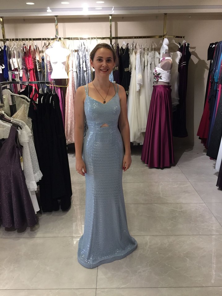 Mavi renkli, uzun boylu, V yakalı ve ince askılı abiye elbise. Hafif yılan derisi desenli ve işlemeli detaylara sahip, klasik şıklık sunar.