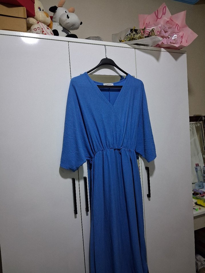 Mavi renkte, keten kumaştan, V yaka ve askılı kollu, bol kesim uzun elbise. Salaş ve drapeli tasarımıyla günlük sokak stili için uygundur. TEMSİLİ MARKA