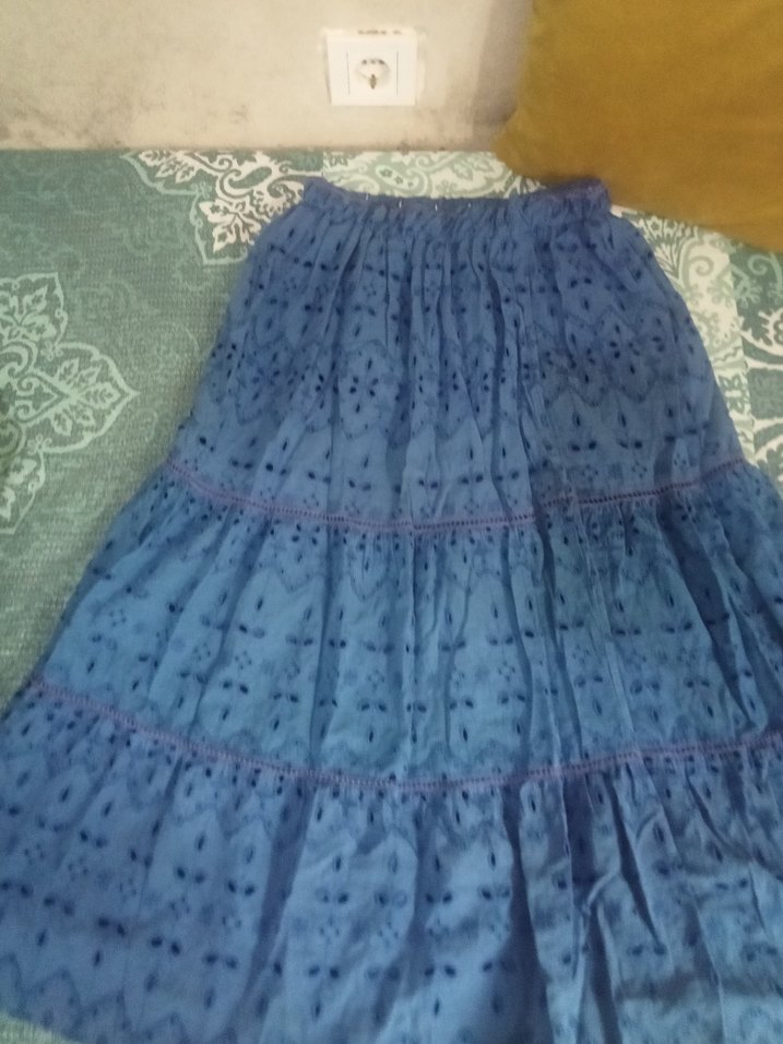 Mavi renkli, uzun ve bol kesimli bu etek, volan detayları ve pastel tonlarda batik deseniyle bohem tarzını yansıtıyor.