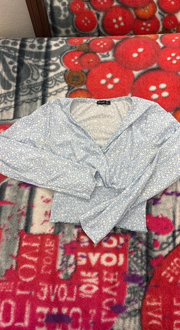 Uzun kollu, V yakalı ve bağlama desenli mavi renkli, pamuklu ve örme dokulu, retro tarzda, günlük kullanıma uygun, dar kesim kadın bluzudur.
