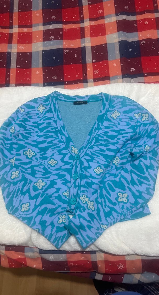 Mavi, V yakalı, uzun kollu, yumuşak sentetik kumaştan örülmüş, bol kesim bağlama desenli çiçek motifli hırka. Rahat, bohem sokak tarzı için uygun.