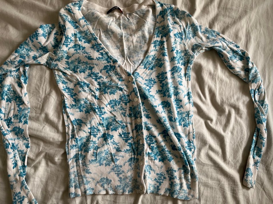 Yumuşak keten kumaştan yapılmış, mavi bağlamalı desenli, bohem tarzda, V yakalı ve uzun kollu, normal boyda hırka.