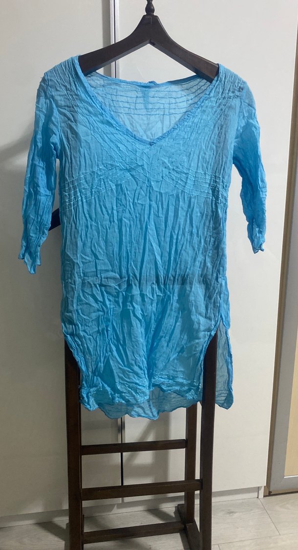 Pastel mavi renkte, V yakalı ve uzun kollu bol kesim tunik. Hafif pamuklu ince kumaştan, drapeli ve desensiz, midi boyda