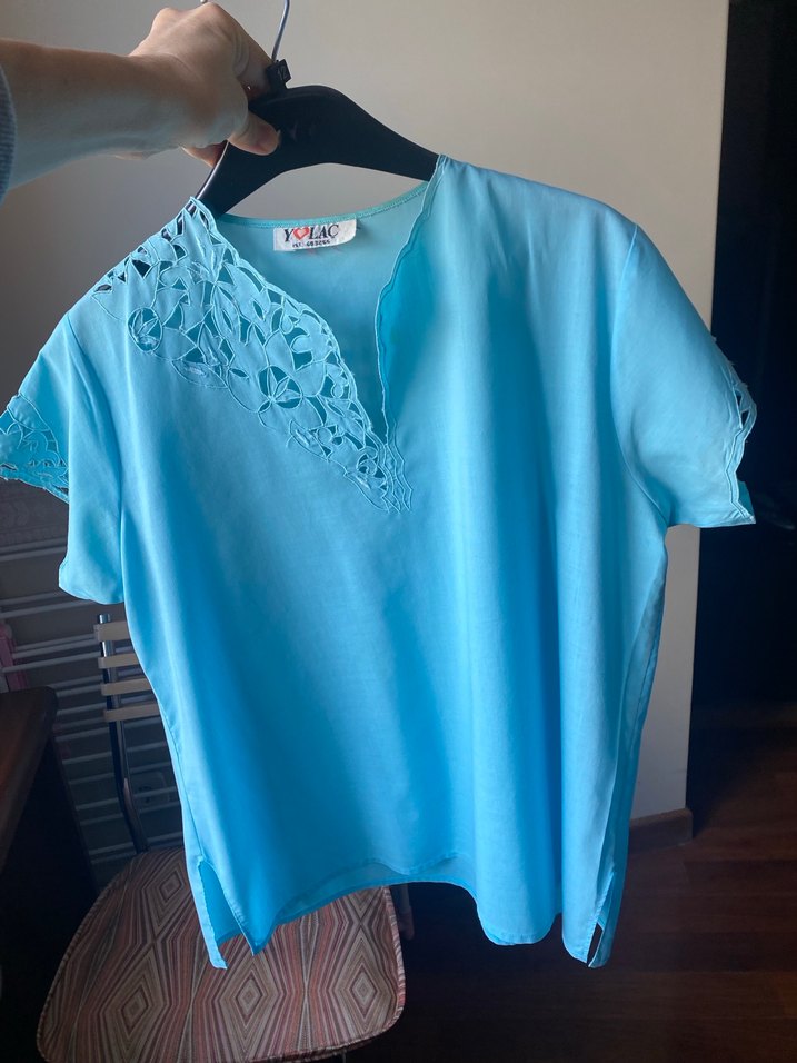 Mavi renkli, gevşek kesim kısa bluz, V yaka ve dantel detaylarına sahiptir. Rahat sentetik kumaştan, günlük kullanıma uygundur. Yazlık ince pamuk poplin kumaş. Yakanın kenarında 1 damla çay lekesi var. Ben yıkamadım yıkayınca çıkabilir