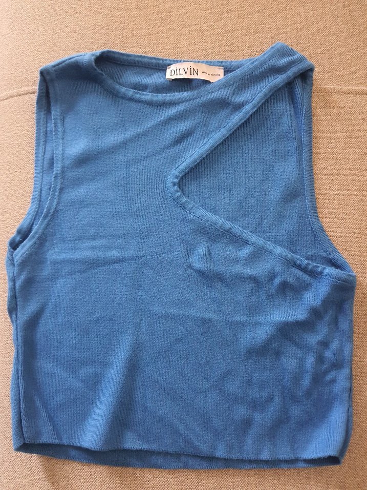 Mavi denim kumaştan, V yakalı ve kolsuz, fitted kesim crop top. Pastel tonlarıyla günlük sokak stiline uygun şık ve sade bir parça. Marka: DILVIN.