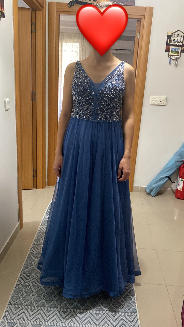 V yaka, kolsuz mavi abiye elbise. Hiç kullanılmadı