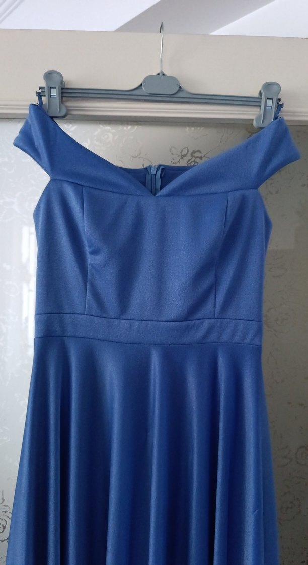 V yaka drapeli, parlak mavi kumaştan, maxi boy, kolsuz, modern klasik tarzda, oturan kesim abiye elbise.