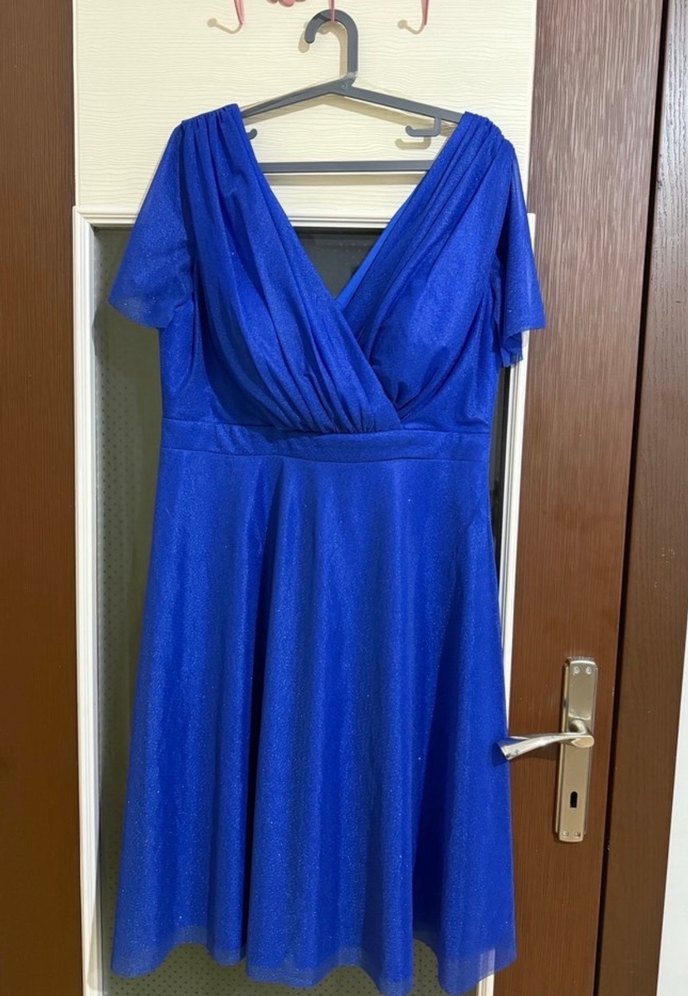 Mavi V Yaka Drapeli Midi Abiye Elbise