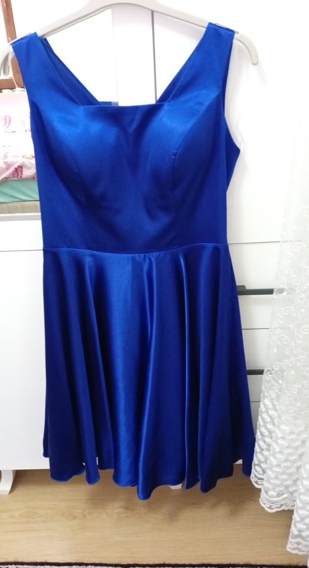 Parlak mavi renkte, V yakalı ve kolsuz, drapeli tasarıma sahip, klasik şıklıkta oturan midi abiye elbise.