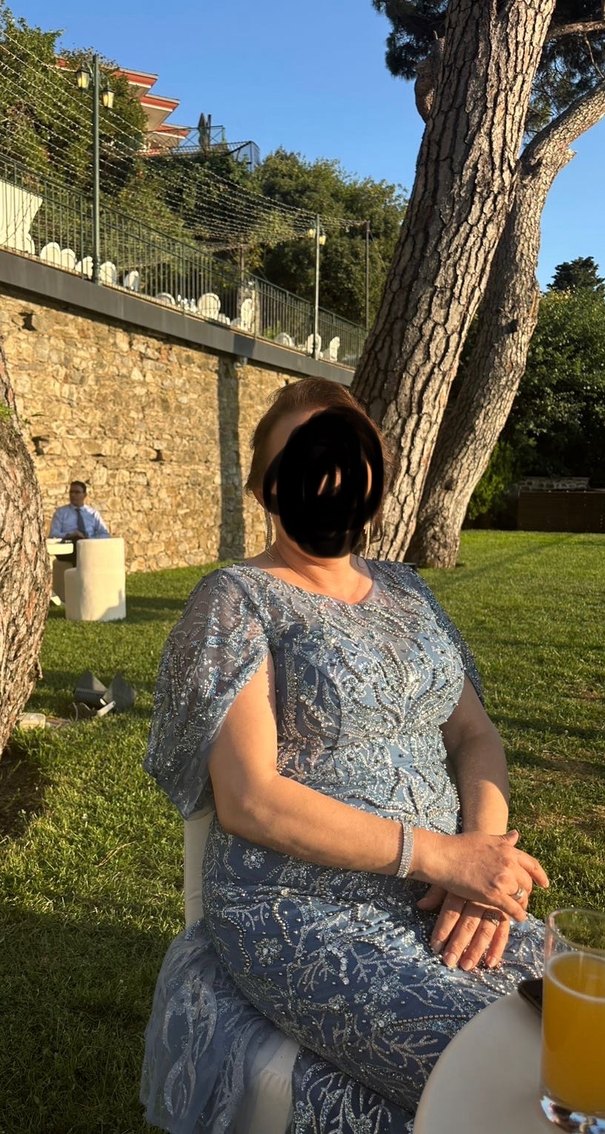 V yaka, kısa kollu, drapeli ve gri desenli abiye