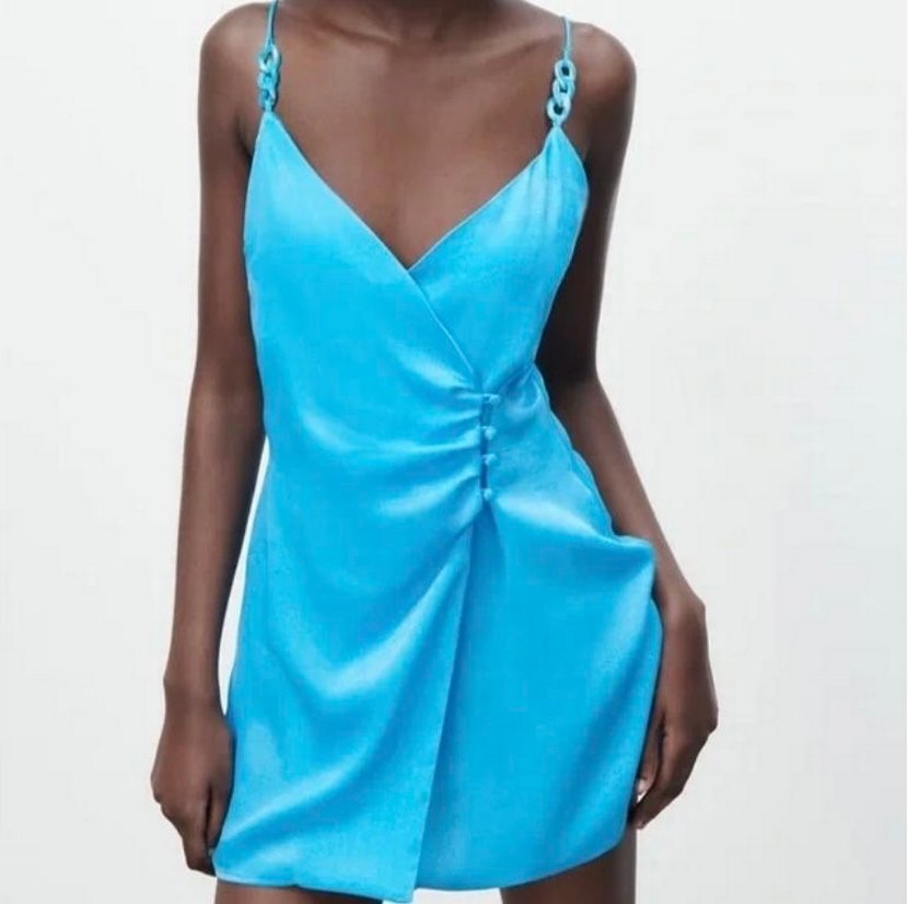 Bu mavi mini elbise, satenimsi kumaşı, drapeli tasarımı ve ince askıları ile dikkat çekiyor. V yaka ve fitted kesimi ile romantik akşamlar için ideal.