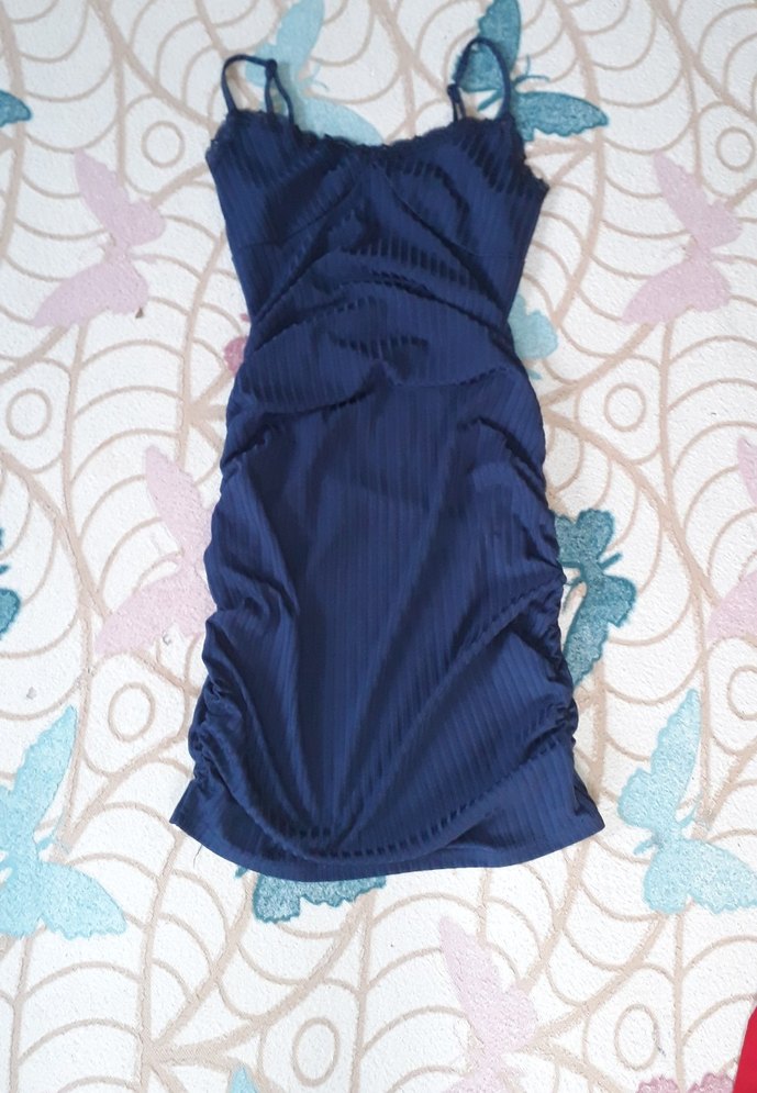 Drapeli kesimi, ince askıları ve V yakasıyla mavi mini elbise. Normal midi boy, koyu mavi tie-dye deseniyle dikkat çeker.