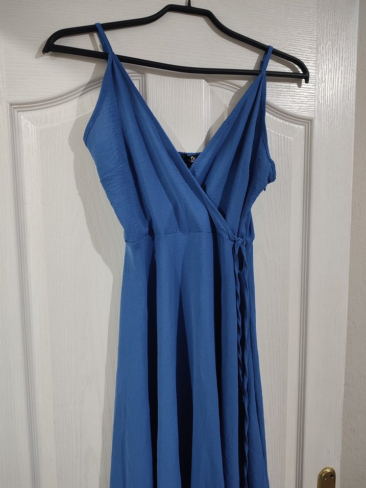 Drapeli tasarımlı, V yakalı ve ince askılı, fitted uzun elbise. Pürüzsüz sentetik kumaştan, koyu mavi renkte, minimalist bohem stilde, günlük kullanıma uygun.