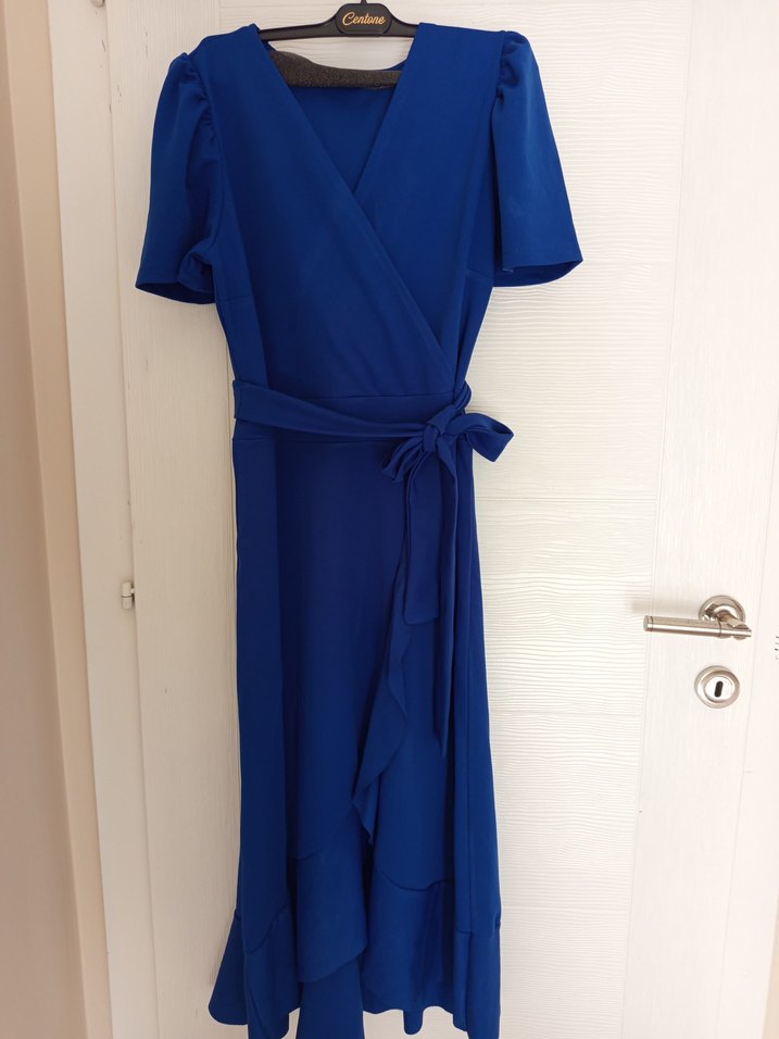 Mavi renkte, V yaka ve drapeli tasarıma sahip uzun elbise. Belde kuşaklı, kısa kollu ve ofis kullanımı için uygun, düz kesim. Yumuşak sentetik kumaştan üretilmiştir.