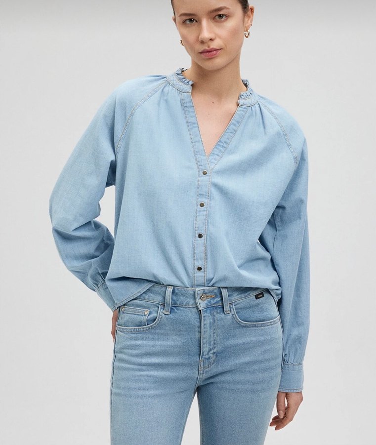 Açık mavi tonlarında, V yaka ve düğmeli ön kısmı olan denim gömlek. Uzun kollu, bol kesim, günlük sokak stili için uygun.