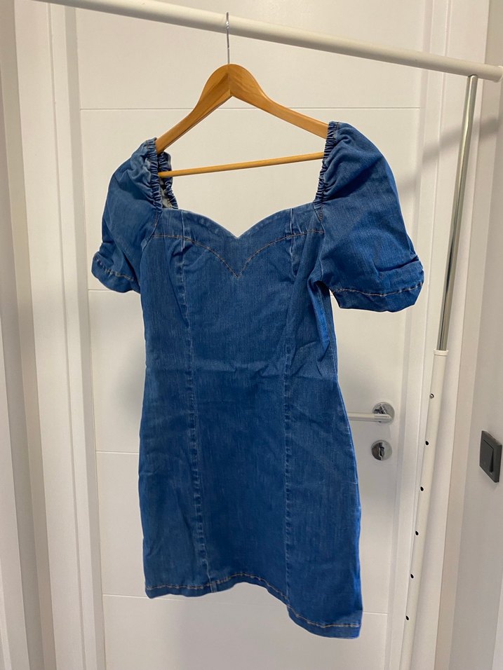 V yaka ve düğmeli, kısa balon kollu mavi denim, vücuda oturan mini elbise. Günlük kullanıma uygun, şık ve rahat bir seçenek. Elastik bir kumaşı var .