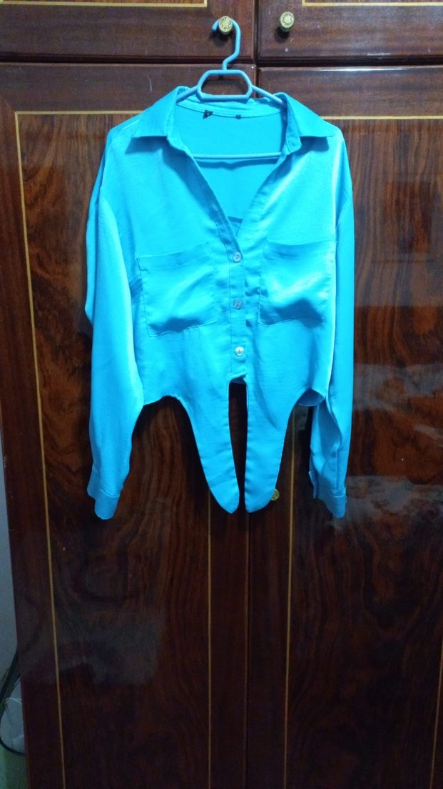 Uzun kollu, V yakalı ve bol kesim kadın gömleği. Parlak, ipeksi kumaştan, düğmeli ve normal midi boyda, günlük kullanım için uygundur.