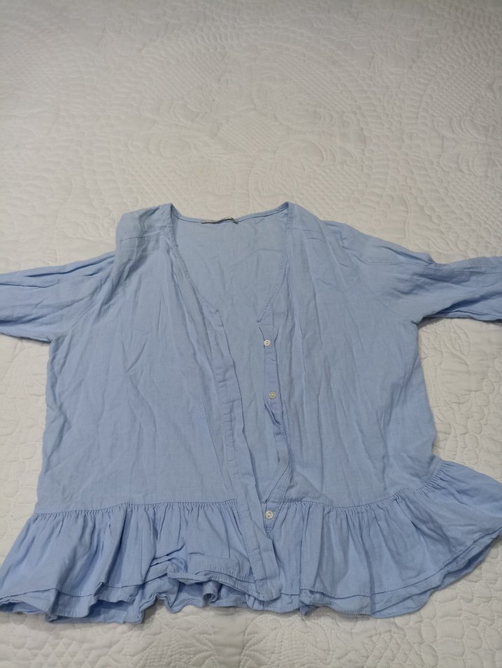 Uzun kollu, V yaka, düğmeli mavi keten gömlek. Salaş kesim ve midi uzunlukta, etek kısmında volan detayı bulunur. Günlük kullanıma uygundur.
