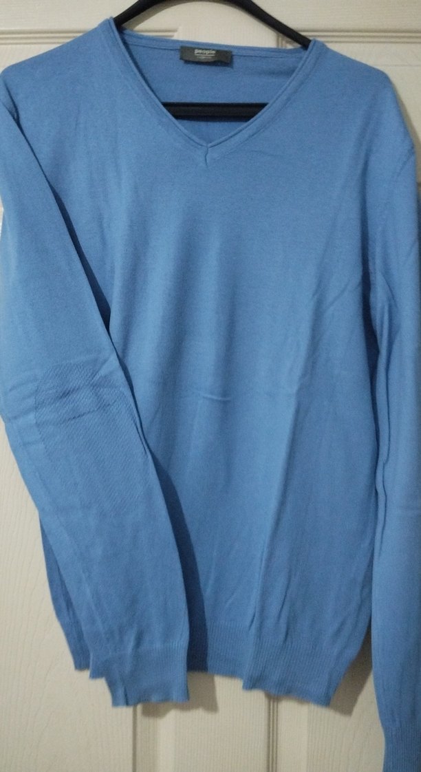 Pastel mavi renkte, V yakalı ve uzun kollu erkek trikosudur. Sentetik kumaştan üretilmiş, rahat kesim ve günlük sokak stili için uygundur. dirsek bölgesi farklı desende dokuma yapılarak şık bir görünüm kazanmış