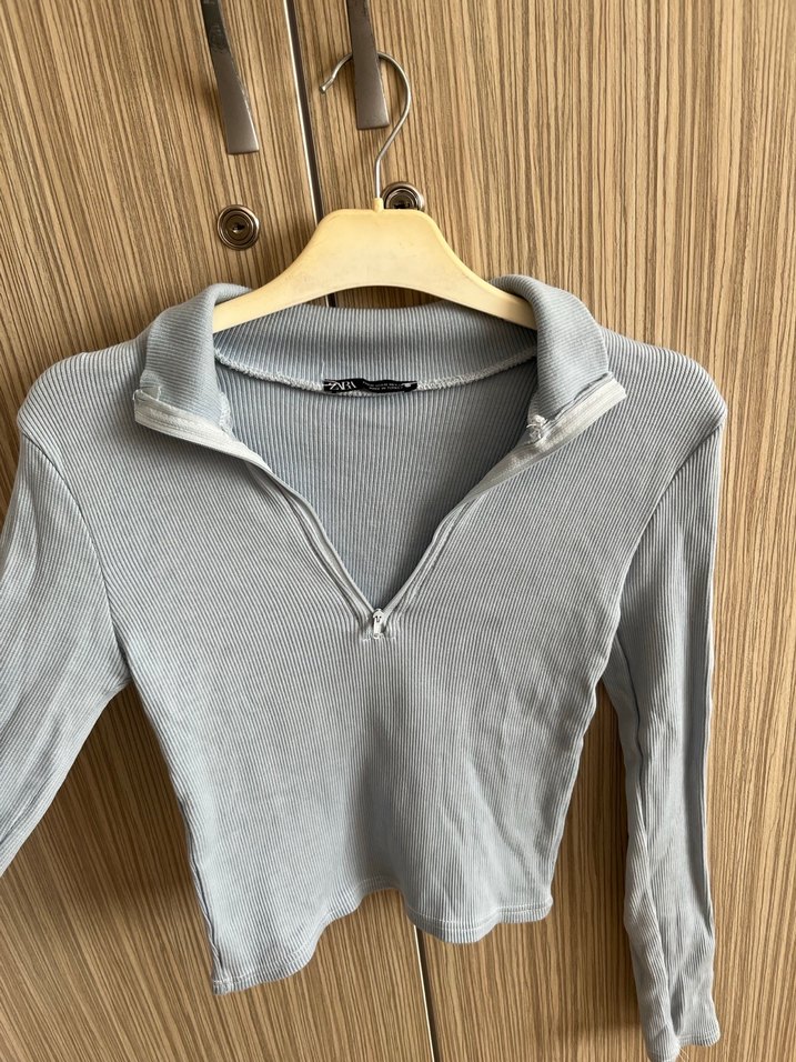 Mavi V Yaka Fermuarlı Kadın Bluz
