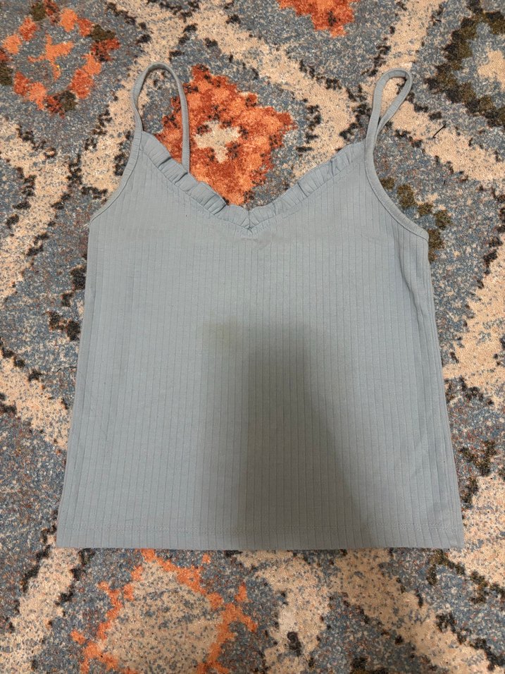 Mavi V Yaka Fırfırlı İnce Askılı Bluz