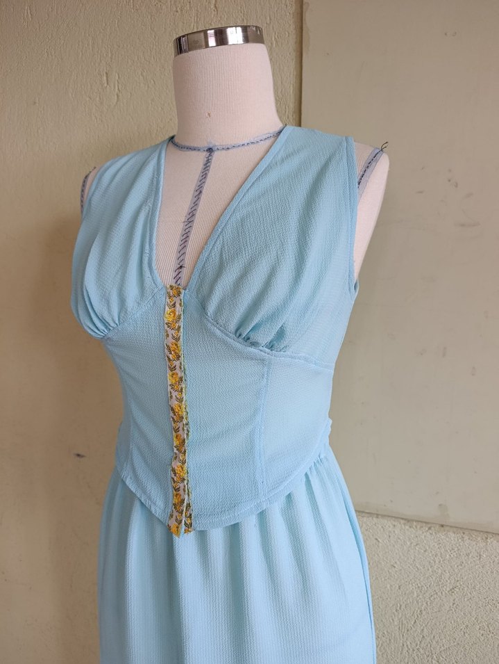 Mavi renkte, V yaka, askısız ve vücuda oturan ikili takım, ön ortada çiçek desenli düğme detayına sahiptir. iç gösterir fotoğraflarda belirttim.