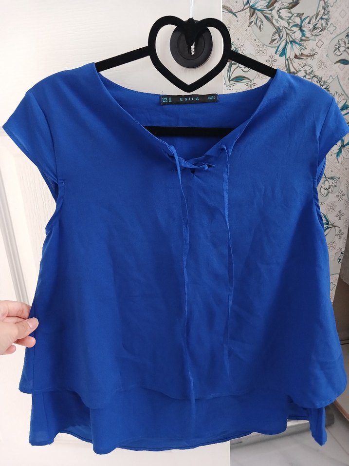 Mavi renkli, V yakalı, kısa kollu, salaş kesim kadın bluz. İpek gibi yumuşak kumaştan üretilmiş, günlük sokak tarzına uygun. M bedendir. #koton #zara #lcw #bershka #kadınbluz #kadıngömlek #kadıngiyim