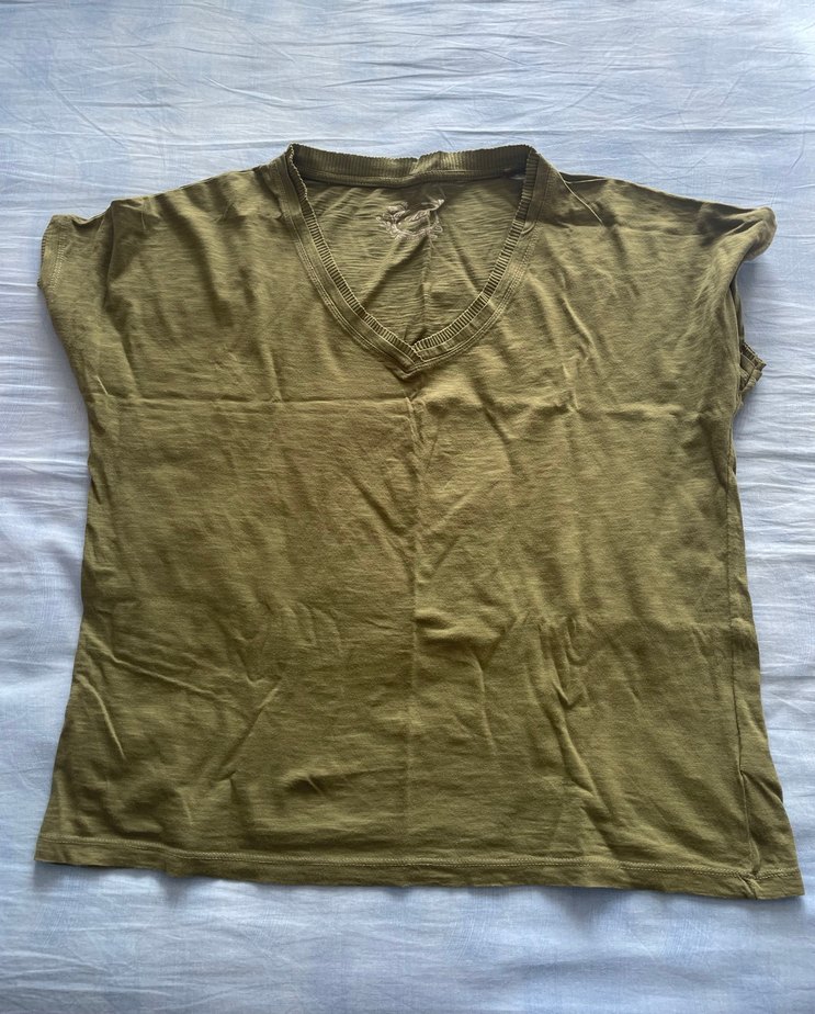 Mavi V yakalı, yeşil renk kumaştan yapılmış, kısa kollu, salaş kesim, desensiz haki renk kadın tişörtü. Orijinal Ürün Beden:M En:54cm Boy:61cm