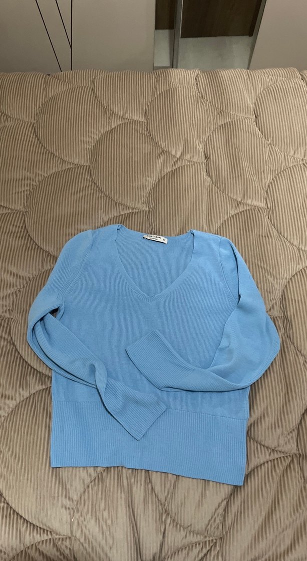Pastel mavi renkte, V yakalı ve uzun kollu kadın triko kazak. Yumuşak keten kumaştan, bol kesim ve normal boyda, rahat kullanım için örülmüş.