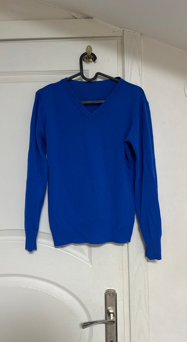 V yaka ve uzun kollu, yumuşak ve sıcak kumaştan örülmüş, mavi renkli, normal boyda kadın triko kazak. Minimalist sokak stiline uygun, günlük kullanıma elverişli.