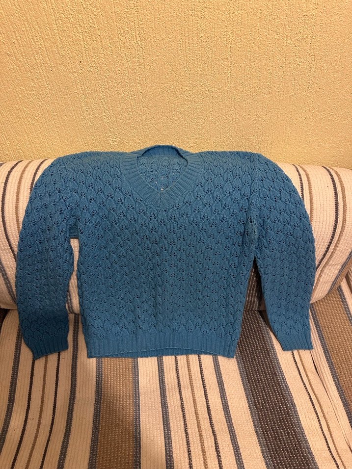 Mavi renkli, V yaka ve uzun kollu kadın triko kazak. Fitted kesim, normal boy ve deseniz örgü dokusuyla günlük kullanıma uygun rahat bir modeldir.