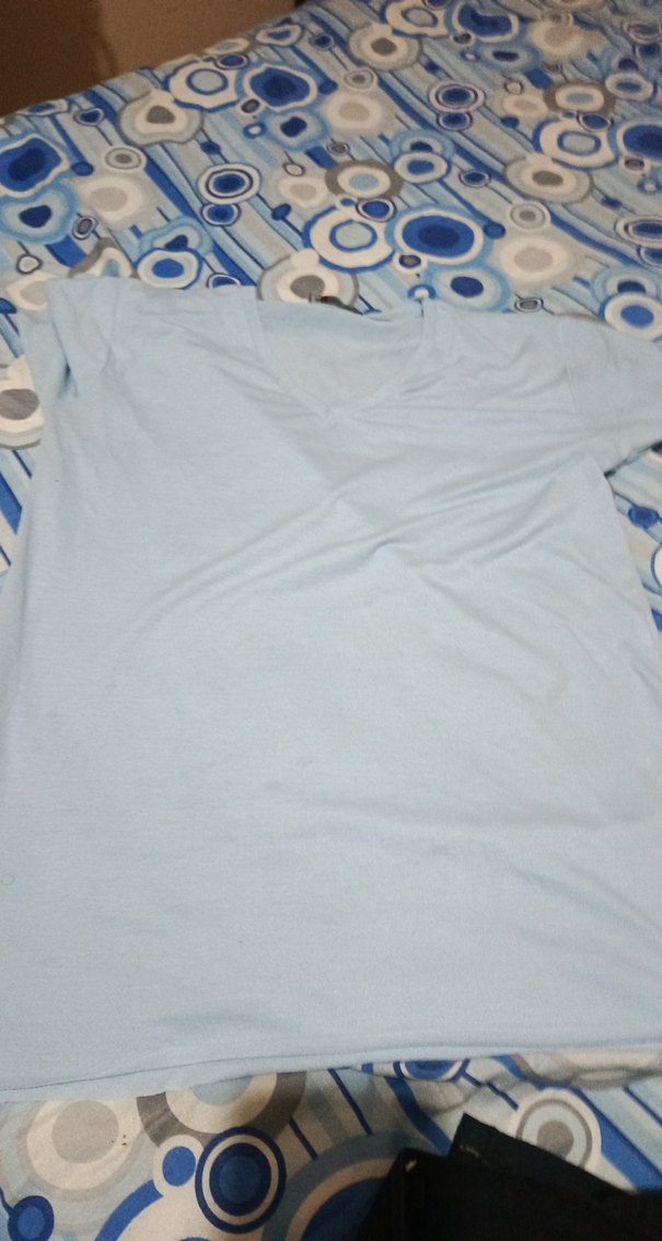 Pastel mavi keten hamile tişörtü, bol kesim, V yaka ve kısa kolludur. Günlük kullanım için nefes alabilir, sade ve şık bir tasarıma sahiptir.