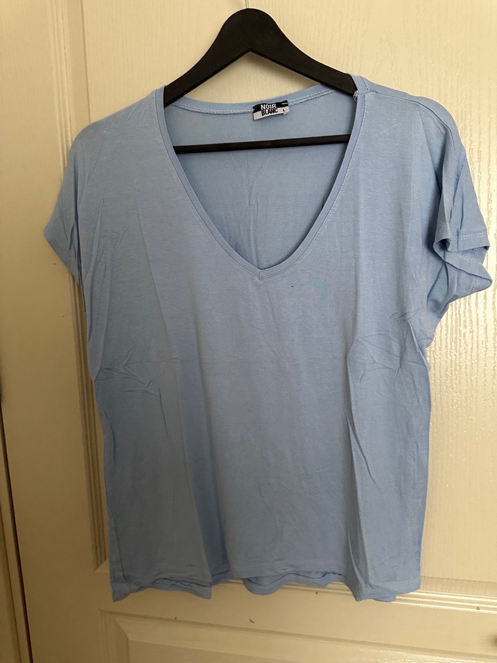 Mavi V yaka, keten kumaştan, kısa kollu, bol kesim kadın tişörtü. Günlük sokak modası için uygundur.
