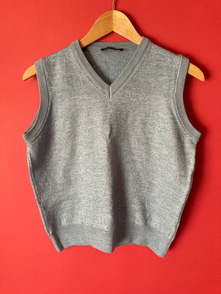 Mavi renk, V yaka, örgü dokulu yün yelek. Orjinaldir, sorunu yoktur. En 51 ve boy 55cm.