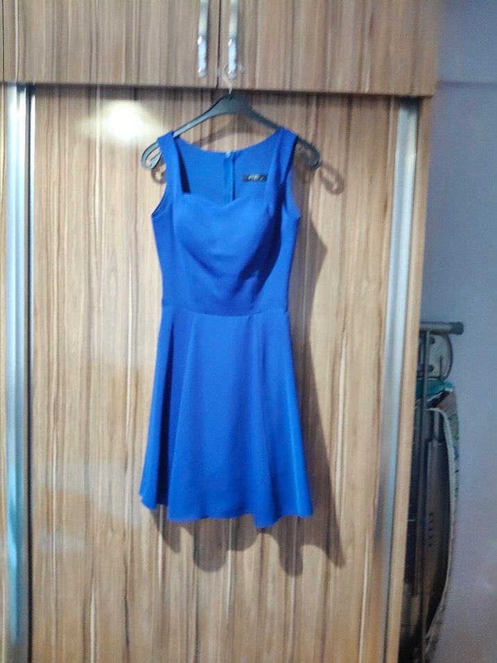 Kolsuz, mavi kısa abiye, v yaka ve pile detaylıdır. Minimalist ve günlük sokak stili için uygundur.
