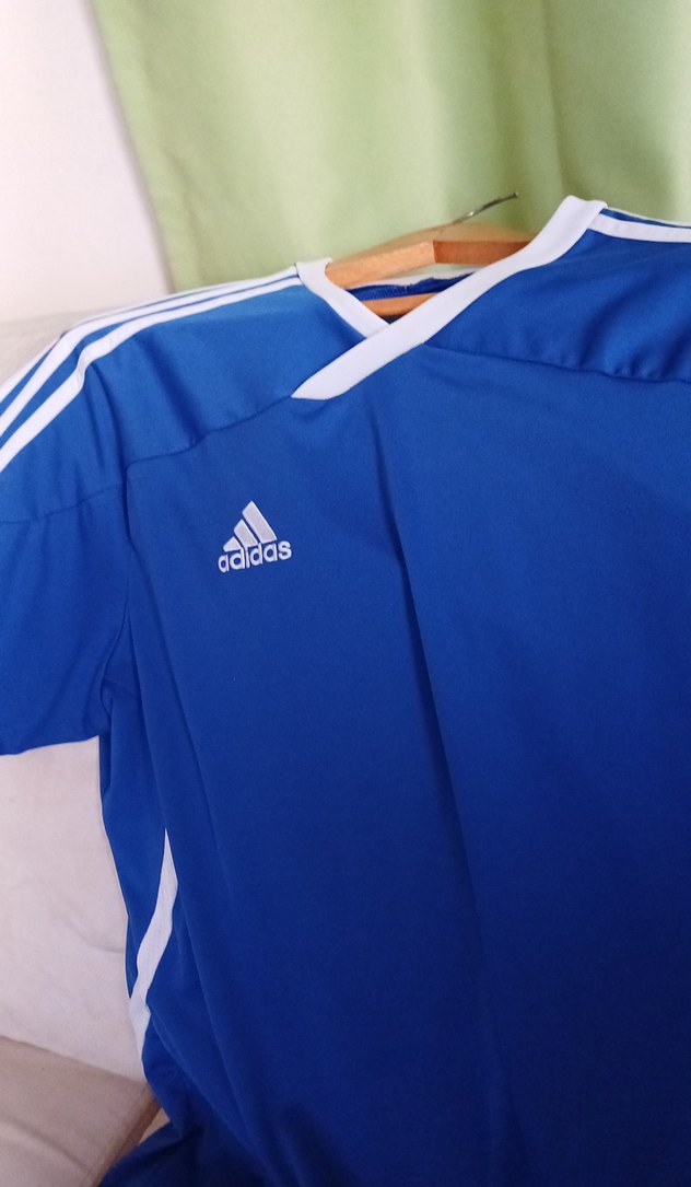 Bu Adidas erkek tişörtü, V yaka ve kısa kollu, vücuda oturan kesime sahiptir. Sentetik kumaştan üretilmiş olup, spor aktiviteleri için rahat bir kullanım sunar. Canlı mavi rengi beyaz şeritler ve cırt cırt detaylarıyla tamamlanmıştır. ⚽