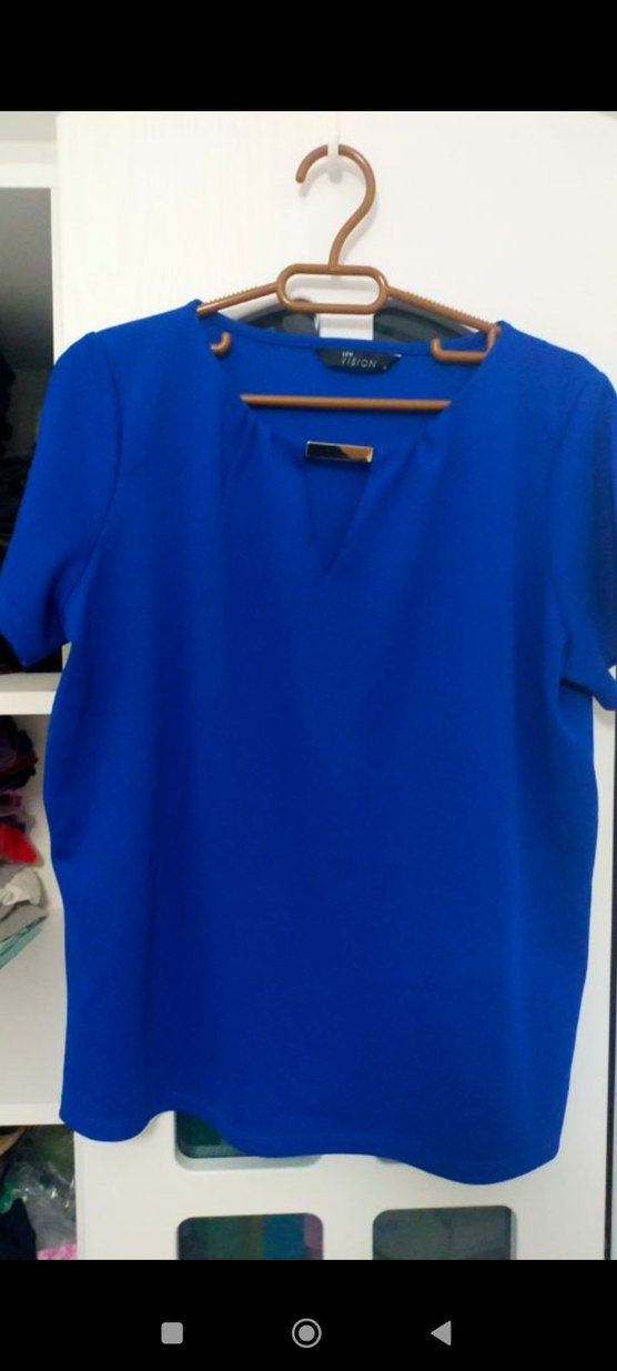 Parlak mavi renkte, V yaka ve kısa kollu kadın bluz. Rahat kesim ve normal midi boyda, ipeksi kumaştan, günlük kullanıma uygun şık bir seçim.
