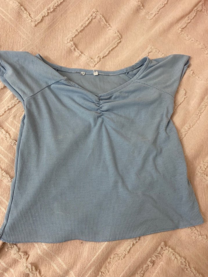 Pastel mavi renkte, V yakalı ve kısa kollu, yumuşak keten kumaştan yapılmış, beli oturan kadın bluzu. Yaka kısmında buruşuk detay bulunur, zahmetsiz şıklık sunar.