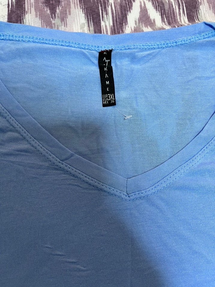 Mavi renkte, V yaka ve kısa kollu kadın tişörtü, pamuklu ve rahat kesimlidir. Pastel tonlarda baskılı deseniyle günlük kullanıma uygundur.