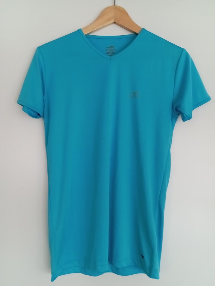 Bu mavi, v yaka ve kısa kollu spor tişörtü, düz ve rahat kesimli, sentetik yumuşak kumaştan üretilmiştir. Az ve temiz kullanılmıştır