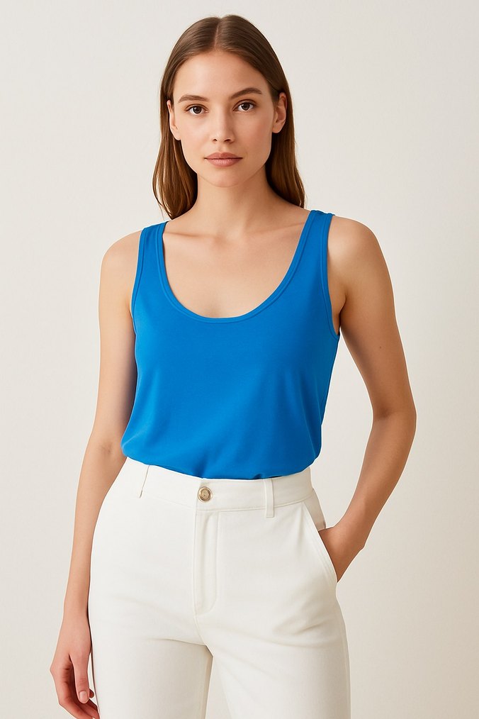 Mavi renkli, V yakalı ve kolsuz kadın atlet. Pamuk kumaştan yapılmış, kısa ve rahat kesim. Minimalist ve çağdaş tarzıyla günlük kullanıma uygun.