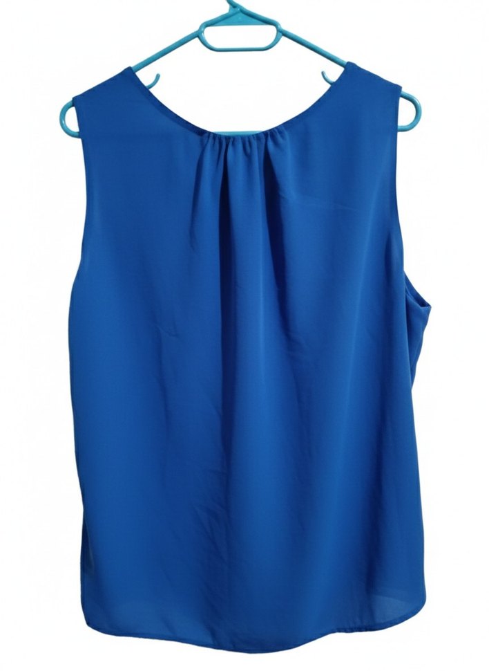 Mavi renkli, V yakalı, kolsuz ve salaş kesimli, drapeli midi boy bluz. Pürüzsüz sentetik kumaştan üretilmiştir, günlük kullanım için uygundur.Boy uzunluğu 62 cm , Göğüs altı 50 cm