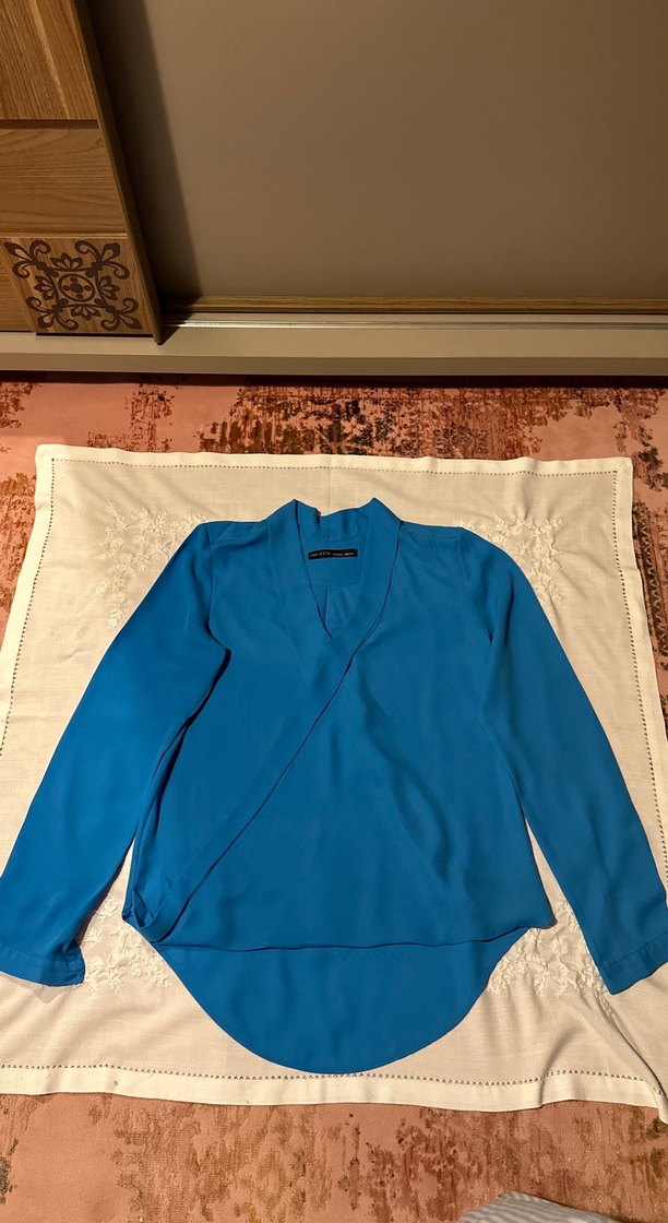 Bu kadın bluz, V yaka ve uzun kollu olup, rahat kesim ve normal midi boyda tasarlanmıştır. Minimalist, normcore tarzda canlı mavi renkte, yumuşak ve sıcak kumaştan üretilmiştir. Ofis ve günlük kullanıma uygundur. Sağ kolunun düğmesi eksiktir.
