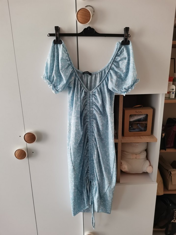 Mavi tie-dye desenli, yumuşak şifom kumaştan üretilmiş, V yakalı ve askılı kollu, vücuda oturan midi boy bohem elbise. Önde büzgülü, drapeli detay içerir.