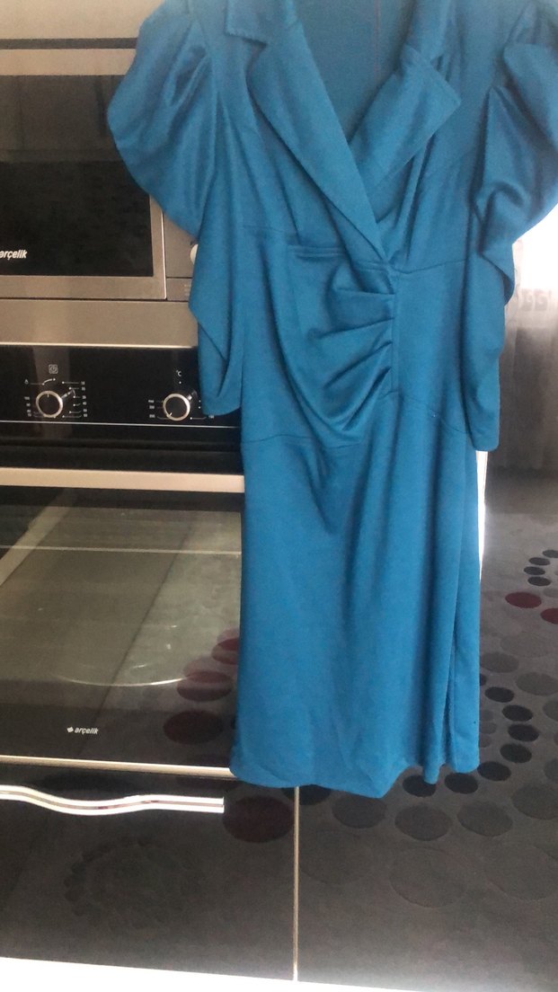 Parlak mavi midi elbise, V yakalı ve kısa kollu, drapeli tasarıma sahip. Salaş kesimi ve çağdaş stiliyle ofis için uygun. ✨