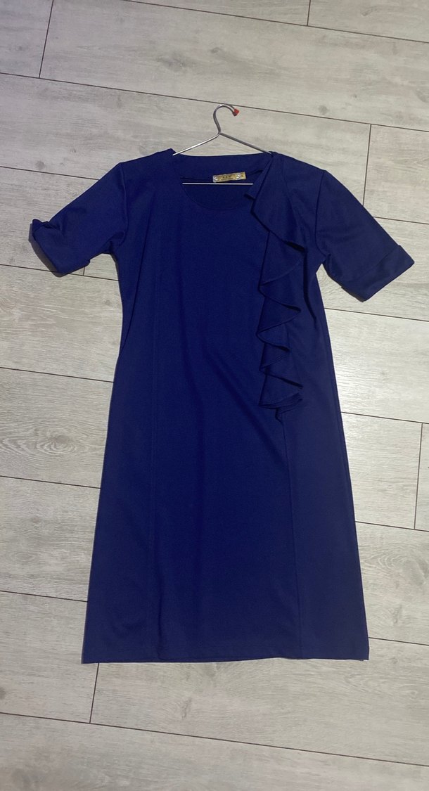 Koyu mavi midi elbise,kısa kolludur. Normal kesim ve tek yan volan detayıyla sade bir tasarıma sahiptir.