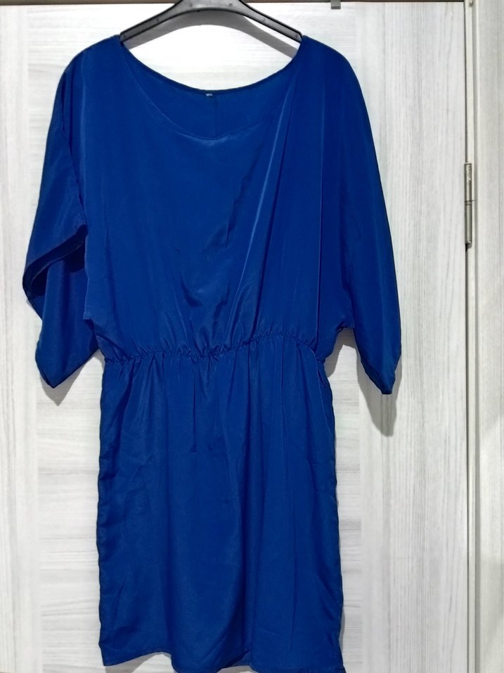 Mavi renkte, V yakalı, kısa kollu, drapeli midi elbise. Rahat kesim ve sentetik kumaştan, günlük kullanıma uygun.