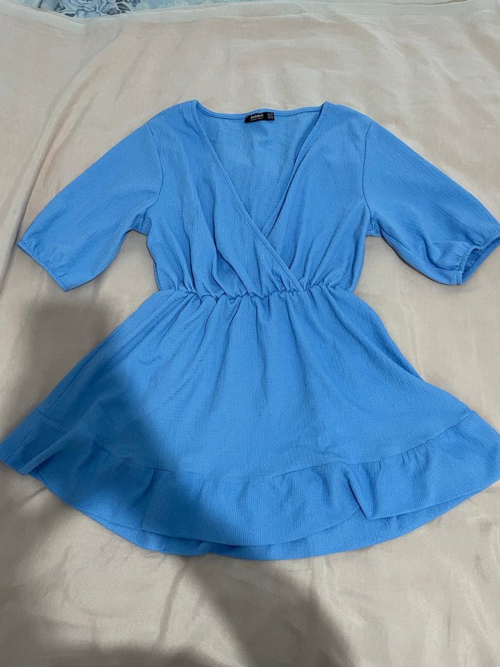 Mavi keten midi elbise, V yaka ve kısa kollu. Etek kısmında fırfır detayıyla rahat ve şık bir görünüm sunar. Günlük kullanım için uygundur.