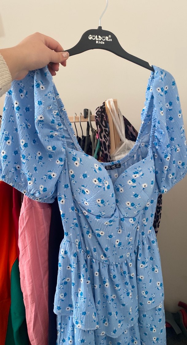 V yaka ve askılı kollara sahip, pamuktan yapılmış mavi çiçek desenli, drapeli, bele oturan midi elbise. Günlük ve sokak stili için uygundur.
