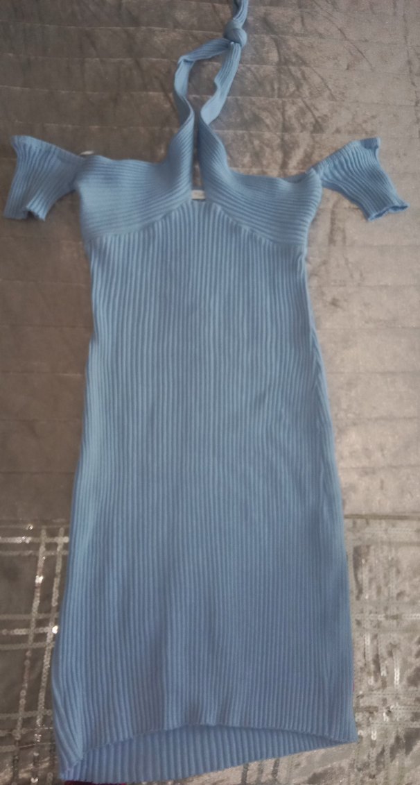Mavi pastel renkte, V yakalı ve kısa kollu, midi boy triko elbise. Sokak stiline uygun, rahat ve şık bir tasarım.